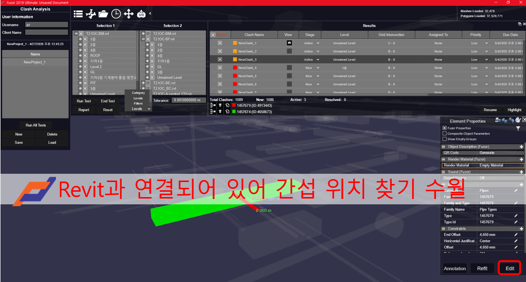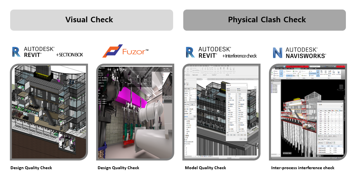 물리적 간섭은 말그대로 각 공정별로 크로스체크를 하면서 간섭이 발생되는 곳은 없는지 물리적으로 부딛히는 영역드를 검토하는 것입니다. 이것은 revit, navisworks, fuzor  모두 각각 검토 기능을 제공하고 있습니다.