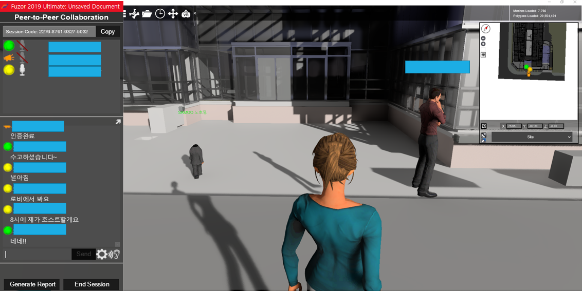 Fozor VDC에서 지원하는 Peer to Peer 기능은 외부에서도 접속가능하여 여러사람이 가상으로 건물을 돌아다니면서 설계검토를 할 수있습니다. 한 사람이 가이드 모드로 화면을 나머지 사람들과 공유할 수도 있습니다.
