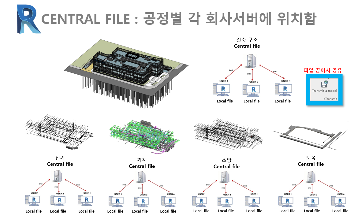 가장 중요한 개념인데 BIM 리더가 서버에 " Centeral File" 이라는 프로젝트 파일 하나를 생성하고 Workset 을 팀원 수만큼 생성합니다. 그럼 나머지 팀원들이 본인의 컴퓨터 ( Local comuputer)에서 Revit 을 열고 "Centeral File"을 open 하고 모델링, 도면화 등을 진행합니다. 작업한 파일을 수시로 Centeral File 업로드하면 본인이 작업한 내용이 전달되는 동시에 지금까지 다른 팀원이 작업한 모델이나 정보들이 동기화(업데이트)됩니다.