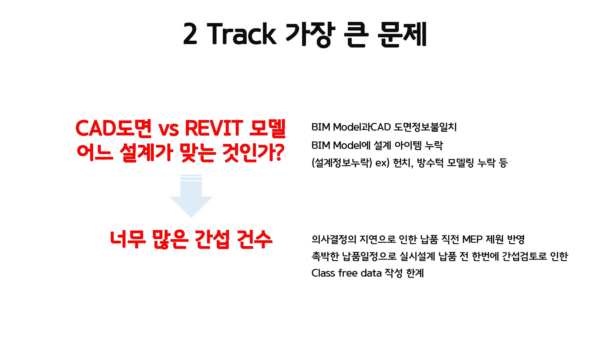 그리고 2 track으로 진행하는 것은 비용적인 부분에서도 사실상 결국 인력을 2배로 쓰는 것이나 다름없기 때문에 결코 효율적이지 않습니다. (아직도 시니어와 주니어들 사이에는 BIM에 대한 온도차이가 분명하게 존재하고 있긴합니다)