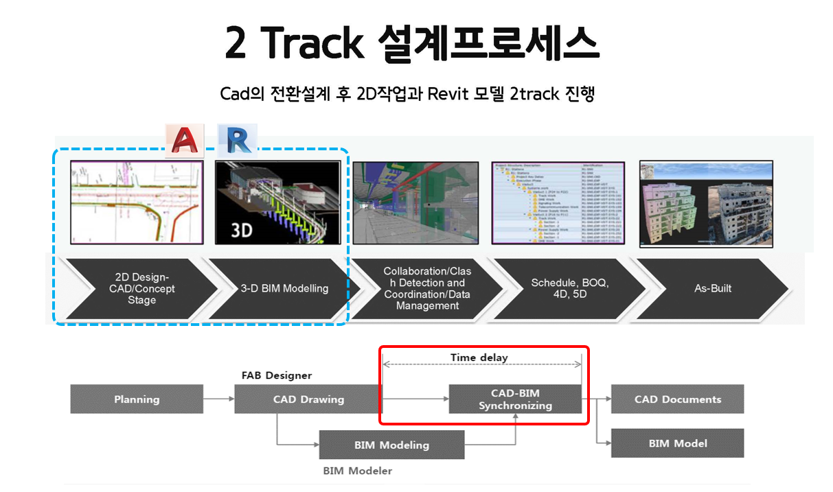 그리고 2 track으로 진행하는 것은 비용적인 부분에서도 사실상 결국 인력을 2배로 쓰는 것이나 다름없기 때문에 결코 효율적이지 않습니다. (아직도 시니어와 주니어들 사이에는 BIM에 대한 온도차이가 분명하게 존재하고 있긴합니다)